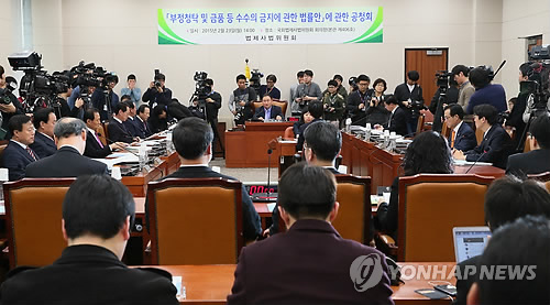 | △ 국회, '김영란법' 공청회' (서울=연합뉴스) 진성철 기자 = 23일 국회 법제사법위원회에서 '부정청탁 및 금품 등 수수의 금지에 관한 법률안(일명 김영란법)에 대한 공청회'가 열리고 있다. |