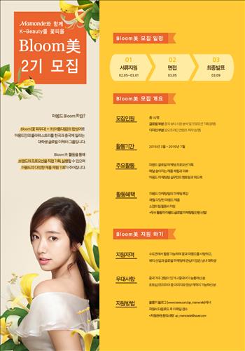 (서울=연합뉴스) 최이락 기자 = 화장품 브랜드 마몽드는 내달 1일까지 마몽드와 함께 한국의 미(K-Beauty)를 꽃피울 대학생 글로벌 마케터 Bloom 美 2기를 모집한다고 24일 밝혔다.