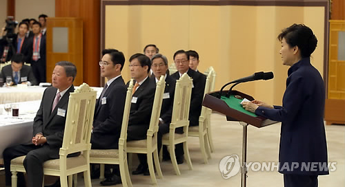 | △ 문화체육 활성화를 위한 기업인 오찬 (서울=연합뉴스) 도광환 기자 = 박근혜 대통령이 24일 청와대에서 열린 '문화체육 활성화를 위한 기업인 오찬'에서 인사말을 하고 있다. 이 자리에는 박용현 한국메세나협회장, 구본무 LG회장, 이재용 삼성전자 부회장, 조양호 한진 회장, 박삼구 금호아시아나 회장, 신동빈 롯데 회장, 정의선 현대차 부회장, 황창규 KT 회장 등이 참석했다. |