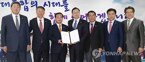 | △ 경북-전남도의회 "동서화합·상생발전" (대구=연합뉴스) 경북도의회와 전남도의회가 24일 경북도의회에서 상생발전과 지방자치발전, 동서화합을 위해 함께 노력하기로 하는 공동합의문을 채택하고 기념촬영을 하고 있다. (경북도의회 제공) |