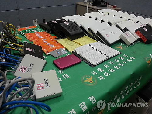 △ 경찰에 압수된 인터넷 공유기 (서울=연합뉴스) 2만여명의 회원을 두고 판돈 9천억원대의 인터넷 도박 사이트를 운영하다 서울지방경찰청 사이버수사대에 적발된 도박업자들이 사용한 인터넷 공유기. 2015.2.24 << 서울지방경찰청 >> photo@yna.co.kr
