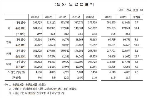 70대 이상 진료비는 14조5천824억원으로 전년 대비 11.4%나 늘었으며 1인당 진료비 역시 전년 대비 6.7% 증가한 362만원이었다.