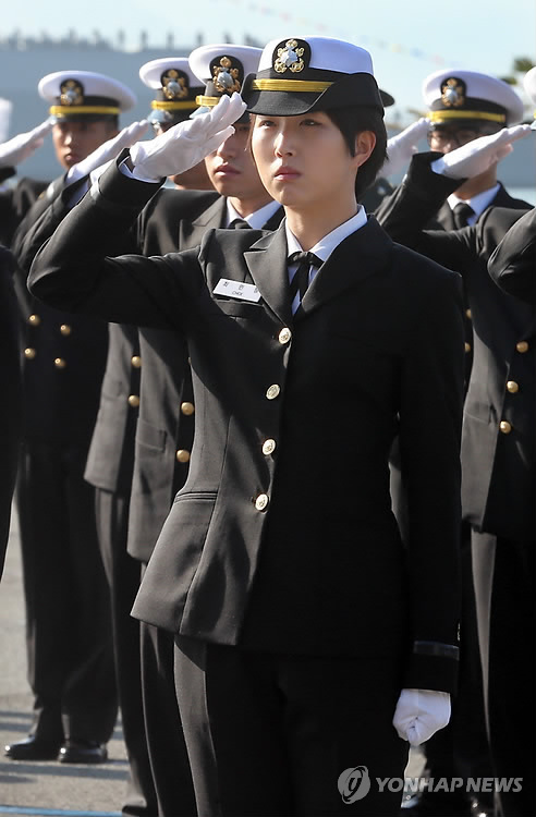 △ 최태원 SK그룹 회장의 차녀 최민정 해군 소위가 지난해 11월 26일 경남 해군사관학교 연병장에서 열린 제117기 해군 사관후보생 임관식에서 경례를 하고 있다. (연합뉴스 자료사진)