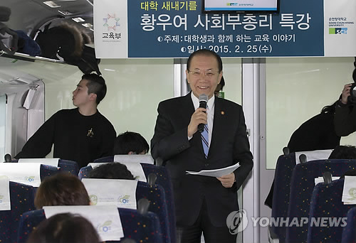 (서울=연합뉴스) 노재현 기자 = 황우여 사회부총리 겸 교육부 장관이 25일 열차에서 대학교 새내기들을 만나는 이색 강의에 나섰다.
