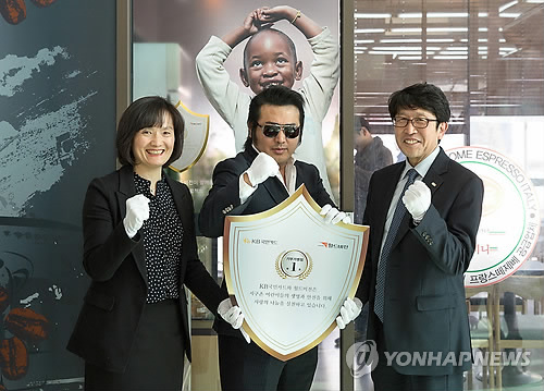 | △ 월드비전, NGO 최초로 기부가맹점 운영 (서울=연합뉴스) 이대희 기자 = 국제구호단체 월드비전은 국내 비정부기구(NGO) 가운데 최초로 기부가맹점을 운영한다고 25일 밝혔다. 지난 24일 서울 중구 KB국민카드 서울고객센터에서 열린 기부가맹점 현판식에서 박기자 KB국민카드 서울고객센터장(왼쪽부터), 김보성 월드비전 홍보대사, 어호선 마케팅부문장이 기념 촬영을 하고 있다. 2015.2.25 << 월드비전 제공 >> 2vs2@yna.co.kr |