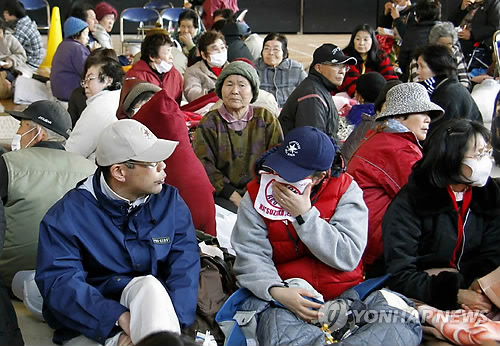 △ 2011년 3월 12일 일본 후쿠시마현 나미에마치에서 원전 폭발에 대비해 피난한 주민들이 불안해 하고 있다. (교도=연합뉴스 자료사진)