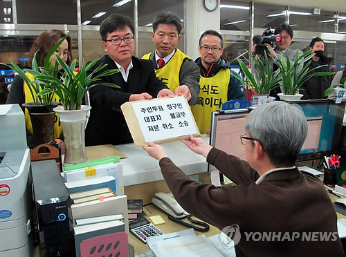 | △ '경남도 무상급식 주민투표 대표증명 거부' 취소 소송 (창원=연합뉴스) 김영만 기자 = 25일 경남 창원지방법원 민원실에서 친환경 무상급식지키기 경남운동본부 측이 경남도지사를 상대로 무상급식 주민투표 청구인 대표자 증명서 불교부 처분 취소 소장을 내고 있다. 경남도가 대표자 증명서 발급을 거부하자 경남운동본부가 법적 대응에 나선 것이다. 2015.2.25 ymkim@yna.co.kr |