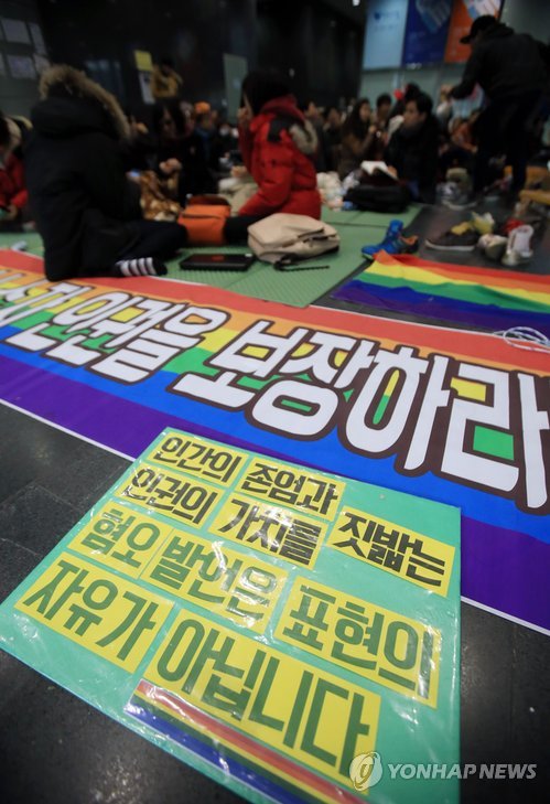 | △ 성소수자 시청 점거 농성 이틀째 (서울=연합뉴스) 홍해인 기자 = 7일 오후 서울 태평로 시청 1층 로비에 점거 농성 중인 성소수자 인권단체 회원들이 모여있다. 이들은 성소수자 차별금지를 명시한 인권헌장을 거부하고 보수기독교단체와 면담에서 '동성애를 지지하지 않는다'는 입장을 밝힌 박원순 서울시장 규탄 농성을 지난 6일부터 시작했다. 2014.12.7 hihong@yna.co.kr |