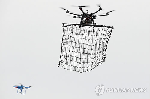 △ 지난 9일 프랑스에서 무인기(드론)를 요격하는 무인기 'MP200'을 시연하는 모습.(AP=연합뉴스 자료사진)