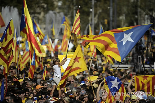 | △ 카탈루냐 광장에 휘날리는 에스텔라다 (AP=연합뉴스) 스페인 카탈루냐주 독립을 주장하는 수천명의 시민들이 주도 바르셀로나의 카탈루냐 광장에서 지난해 10월 19일(현지시간) 주정부 깃발 에스텔라다를 흔들며 독립을 외치고 있다. marshal@yna.co.kr EDS NOTE - SPANISH LAW REQUIRES THAT THE FACES OF MINORS ARE MASKED IN PUBLICATIONS WITHIN SPAIN A young supporter is held above the crowd as they wave estelada or pro independence flags, as they gather in Catalonia square during a rally in Barcelona, Spain, Sunday, Oct. 19, 2014. Thousands of demonstrators crowded a central square in Barcelona during the main campaign event organized by two major pro independence civil society organizations ahead of the vote scheduled for Nov. 9th. Spain's wealthy Catalonia region calls off an independence vote but says an unofficial poll would still be held next month to gauge secessionist sentiment. Separatists in northeastern Catalonia, which has 7.5 million people, have been trying for several years to hold a breakaway vote from Spain to carve out a new Mediterranean nation. (AP Photo/Manu Fernandez) |