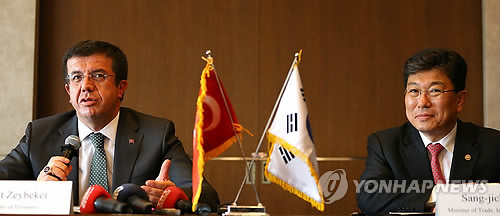 윤상직 산업통상자원부 장관과 니하트 제이베크지 터키 경제부 장관은 26일 서울 소공동 롯데호텔에서 양국간 자유무역협정(FTA) 서비스·투자 분야 협정문에 정식서명했다.