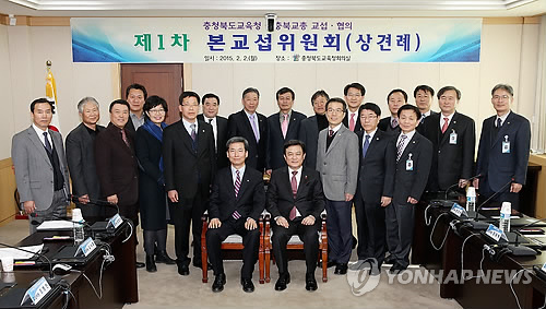 △ 충북교육청-충북교총 단체교섭 돌입 (청주=연합뉴스) 윤우용 기자 = 충북도교육청과 충북도교원단체총연합회는 2일 상견례를 갖고 본격적인 단체교섭에 들어갔다. 양측은 2주마다 양측 대표 각 7명이 참여하는 교섭소위원회를 갖는 한편 김병우 교육감과 윤건영 충북교총 회장 등이 참석하는 본교섭은 5차례 이내로 열기로 했다. 2015.2.2 <<충북도교육청 제공>> ywy@yna.co.kr