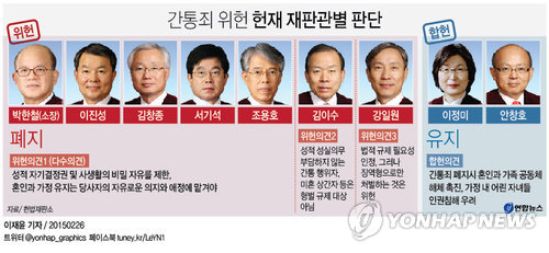 이들 재판관은 "세계적으로 간통죄가 폐지되고 있는 가운데 간통죄에 대한 국민의 인식이 더 이상 일치하지 않는다"며 혼인과 가정의 유지는 당사자의 자유로운 의지와 애정에 맡겨야 한다"고 강조했다.