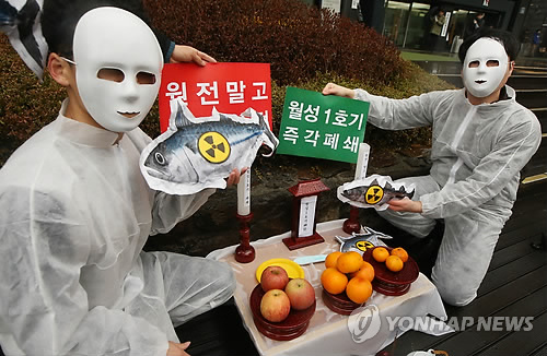 △ 월성1호기 폐쇄 기원 (서울=연합뉴스) 김주성 기자 = 환경운동연합 회원들이 16일 오후 서울 광화문 원자력안전위원회 앞에서 설계수명이 끝나 3년째 가동이 중단된 월성 원전 1호기의 폐쇄를 촉구하는 차례 퍼포먼스를 하고 있다. 2015.2.16 utzza@yna.co.kr