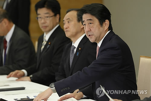 | △ IS 인질사태 대책회의 중인 아베 신조(오른쪽) 일본 총리와 스가 요시히데(오른쪽 두번째) 관방장관(AP=연합뉴스DB) |
