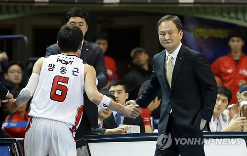 △ '수고했어' (서울=연합뉴스) 김주성 기자 = 28일 오후 서울 잠실실내체육관에서 열린 프로농구 서울 삼성 대 울산 모비스 경기. 유재학 모비스 감독이 맹활약을 펼친 양동근을 불러들이며 손바닥을 부딪치고 있다. 2015.2.28 utzza@yna.co.kr