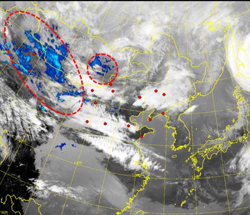 | △ 오후 2시 현재 황사가 발생한 중국 내륙 및 고비사막 부근(붉은 색 점선. 기상청 제공) |