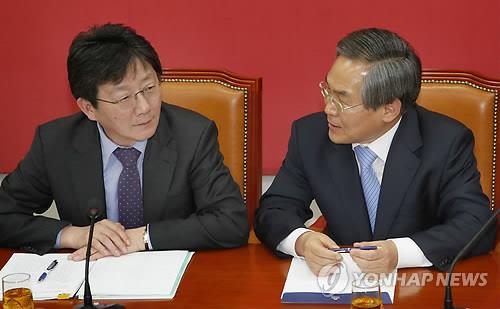 △ 대화하는 여야 원내대표 (서울=연합뉴스) 이상학 기자 = 새누리당 유승민 원내대표와 새정치민주연합 우윤근 원내대표가 김영란법 처리 등과 관련해 2일 오후 국회에서 회동을 갖고 대화를 하고 있다.