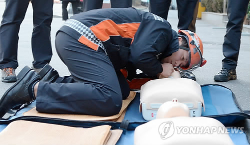 | △ (서울=연합뉴스) 영등포소방서 소방대원이 2015년부터 본격 시행되는 '소방차-구급차 동시출동'을 위해 자동제세동기(AED)를 통한 심폐소생술 숙달훈련을 실시하고 있다. 2015.2.3 << 영등포소방서 제공 >> photo@yna.co.kr |