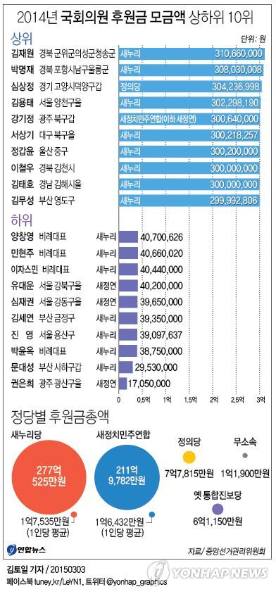 중앙선거관리위원회가 3일 공개한 '2014년도 국회의원 후원금 모금액' 자료에 따르면 김 대표는 후원회를둔 전체 의원 299명(해산된 통합진보당 포함) 가운데 10위를, 문 대표는 48위로 상위권에 올랐다.