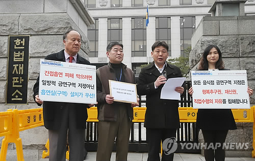 (서울=연합뉴스) 고유선 설승은 기자 = 모든 음식점을 금연구역으로 지정한 것이 음식점 업주들의 영업권과 재산권을 침해한다며 흡연자단체가 헌법소원을 냈다.