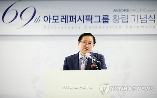 △ 서경배 회장 "아름다움 창조해 글로벌로 도약해야" (서울=연합뉴스) 서경배 아모레퍼시픽그룹 회장이 5일 서울 중구 청계천로 아모레퍼시픽 본사에서 열린 창립 69주년 기념식에서 "우리는 지금 미지의 아름다움을 창조해 글로벌로 도약해야 하는 선택의 갈림길에 서 있다"고 말했다. 2014.9.5 << 아모레퍼시픽그룹 제공 >> photo@yna.co.kr