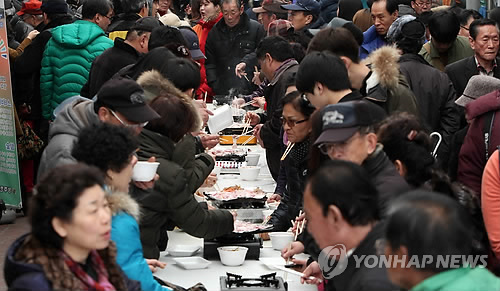 △ 500인분 삼겹살 무료시식행사 (청주=연합뉴스) 김형우 기자 = 삼겹살데이로 불리는 3월 3일 청주시 상당구 서문동 서문시장에서 청주삼겹살거리 상인회가 마련한 500인분 삼겹살 무료시식 행사에 참가한 시민들이 삼겹살을 구워 먹고있다. 2015. 3. 3 vodcast@yna.co.kr