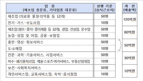 개정안에 따르면 매출액 기준은 업종별로 120억원, 80억원, 50억원, 30억원, 10억원 이하 등 5개 그룹으로 나뉜다.