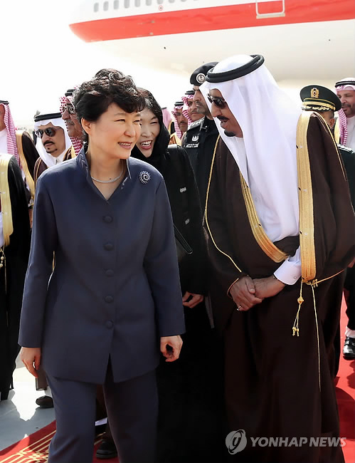 △ 알 사우드 국왕 영접 받는 박 대통령 (리야드=연합뉴스) 도광환 기자 = 중동 4개국을 순방중인 박근혜 대통령이 3일 오후 (현지시간) 두 번째 순방국인 사우디아라비아 리야드 킹칼리드 국제공항에 도착, 살만 빈 압둘아지즈 알 사우드 국왕의 영접을 받고 있다.