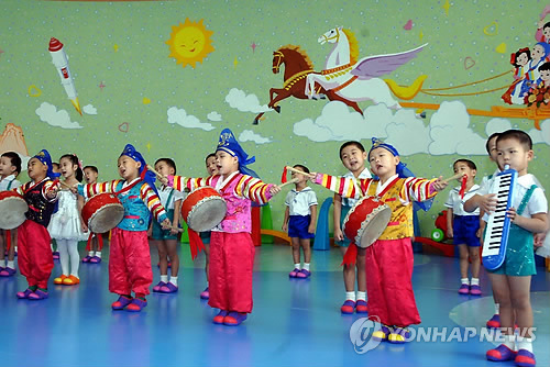 | △ 공연 펼치는 평양육아원 원아들 (평양 조선중앙통신=연합뉴스) 22일 평양육아원에서 한복 차림의 원아들이 공연을 펼치고 있다. 조선중앙통신은 북한 김일성 전 주석의 부인 김정숙의 97번째 생일을 이틀 앞두고 이날 북한 주재 대사관, 국제기구대표부 여성들이 평양육아원과 애육원을 참관했다고 보도했다. 2014.12.22 photo@yna.co.kr |