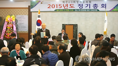 | △ (제주=연합뉴스) 변지철 기자 = 지난 2월 오전 제주시 하니관광호텔에서 열린 제주4·3희생자유족회 2015년도 정기총회에서 유족회가 올해 열리는 4·3희생자 추념식에 박근혜 대통령이 참석해 줄 것을 요청하고 있다. 2015.2.27 bjc@yna.co.kr |