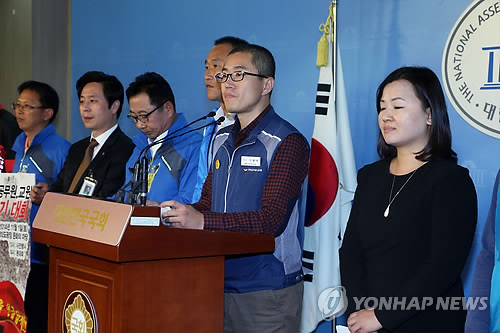 | △ (서울=연합뉴스) 최재구 기자 = 이충재 공무원노조위원장을 비롯한 공적연금 개악 저지를 위한 공동투쟁본부 조합원들이 작년 10월 국회 정론관에서 새누리당 공무원연금법 개정안에 반대하는 기자회견을 하고 있다. 2014.10.27 eck9@yna.co.kr |