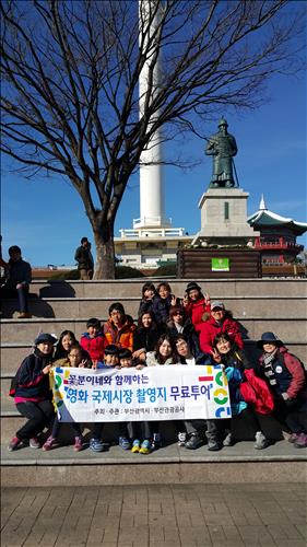 | △ 영화 국제시장 촬영지를 둘러본 관광객들이 용두산공원에서 기념촬영하고 있는 모습. <부산관광공사 제공> |