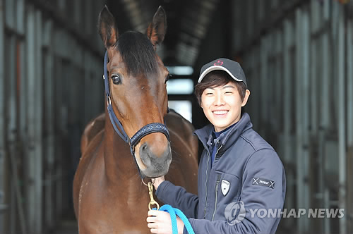 △ 새롭게 도전하는 꼴지마 '차밍걸' (서울=연합뉴스) 101전 전패란 한국경마 최다연패기록을 세우고 2013년 9월 은퇴한 경주마 '차밍걸'이 19일 경북 상주 국제 승마장에서 열리는 2014년 전국 국산마승마대회 장애물경기에 경기용 승용마로 첫 데뷔전을 갖는다. 지난 18일 차밍걸이 경기도 화성시 궁평목장 실내승마연습장에서 류은식 선수와 함께있다. 2014.7.19 << 한국마사회 제공 >> photo@yna.co.kr