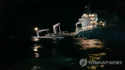 △ 군산 어청도 앞바다 선박 추돌사고..18명 전원 구조 (군산=연합뉴스) 김진방 기자 = 4일 오후 11시15분께 전북 군산시 어청도 서쪽 15km 해상에서 홍콩 선적 4천400t급 화물선이 모래 채취선을 추돌했다. 화물선에는 선원 18명이 탄 것으로 알려졌으며, 근처를 지나던 선박들과 신고를 받고 출동한 군산해양경비안전서의 경비정에 의해 모두 구조됐다. 사진은 사고 선박 모습. 2015.3.5 chinakim@yna.co.kr
