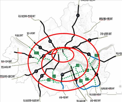 방사형 중앙차로는 외곽에서 도심으로 뻗어나가는 형태(아래 지도 중 검은 선 부분)로 된 점을 고려, 수평적인 연결(빨간 선 부분)을 추가하는 방식이다.