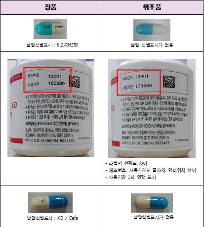 이 가짜 의약품은 빈 캡슐에 밀가루와 찹쌀가루를 넣은 것으로 약효가 전혀 없으며, 제품과 포장용기는 정품과 유사하지만 캡슐 낱알에 식별표시가 없고 라벨의 기재사항 등이 선명하지 않다.