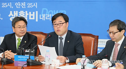 | △ 모두발언하는 김기식 (서울=연합뉴스) 진성철 기자 = 새정치민주연합 김기식 정무위 야당 간사가 5일 국회에서 열린 정책조정회의에서 모두발언하고 있다. 왼쪽 부터 강기정 정책위의장, 김기식, 김성주 복지위 야당 간사. |