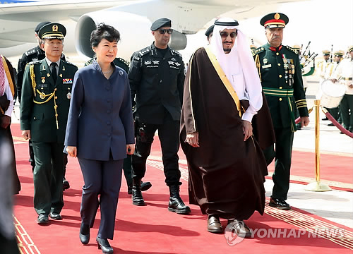 △ 중동 4개국을 순방중인 박근혜 대통령이 지난 3일 오후 (현지시간) 두 번째 순방국인 사우디아라비아 리야드 킹칼리드 국제공항에 도착, 살만 빈 압둘아지즈 알 사우드 국왕의 영접을 받고 있다.