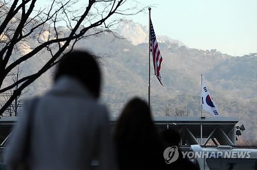 | △ 리퍼트 미대사 테러..한미관계 위기 오나 (서울=연합뉴스) 신준희 기자 = 마크 리퍼트 주한 미대사에 대한 테러 사건이 발생한 5일 오전 서울 종로구 주한미국대사관에 걸린 성조기와 역사박물관 앞 태극기가 함께 보이고 있다. |
