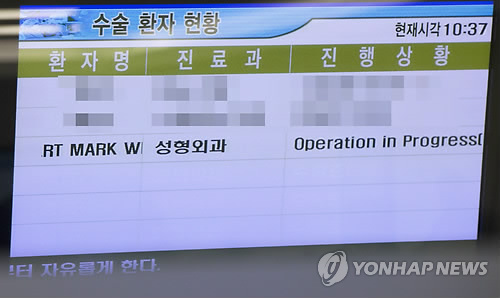 | △ 수술 중인 마크 리퍼트 주한 미국대사 (서울=연합뉴스) 윤동진 기자 = 5일 서울 서대문구 세브란스병원에 마크 리퍼트 주한 미국대사의 이름이 수술 현황 알림판에 표기돼 있다. 리퍼트 미대사는 오전 서울 세종문화회관에서 열린 민화협 주최 초청 강연에 참석했다가 괴한의 공격을 받았다. 2015.3.5 mon@yna.co.kr |