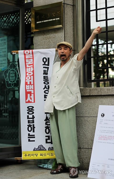 | △ 리퍼트 주한미국대사 습격 피의자 김기종 씨 (서울=연합뉴스) 마크 리퍼트 주한미국대사가 5일 오전 7시 40분께 세종문화회관 세종홀에서 열린 민족화해협력범국민협의회(민화협) 주최 조찬 강연회 장소에서 강의를 준비하는 도중 진보 성향 문화운동 단체인 우리마당 대표 김기종 씨로부터 흉기로 얼굴과 왼쪽 손목 부위를 공격당했다. 사진은 지난 2010년 외교통상부 앞에서 일본의 독도영유권 주장에 반대하는 1인 시위를 하는 김기종 씨. 김 씨는 시게이에 도시노리 주한 일본대사에게 돌을 던져 징역2년, 집행유예 3년을 선고받은 바 있다. |