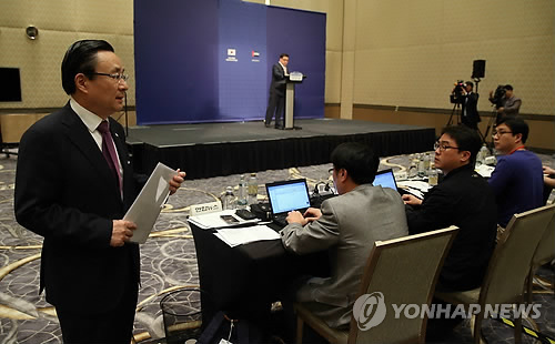 △ 질문받는 주철기 외교안보 수석 (아부다비=연합뉴스) 도광환 기자 = 주철기 청와대 외교안보 수석이 5일 오전(현지시간) 아랍에미리트 아부다비 기자실에서 브리핑을 마친 뒤 리퍼트 주한 미국대사 피습사건에 대한 대응책 등을 질문받고 있다.