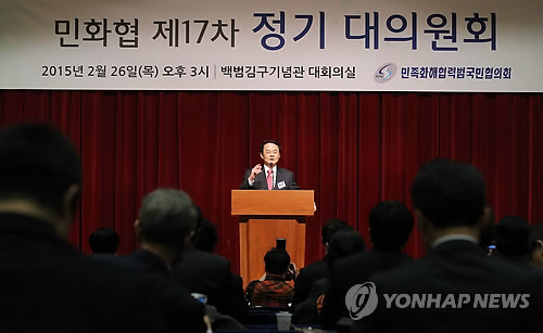△ 홍사덕 민족화해협력범국민협의회 대표상임의장이 지난달 26일 오후 서울 용산구 효창동 백범김구기념관 대회의실에서 열린 민화협 제17차 정기 대의원회에서 대회사를 하고 있다.