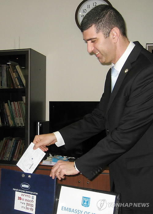 | △ 조기총선 투표를 하는 다비드 레비 이스라엘 대사관 공관차석 (서울=연합뉴스) 김경윤 기자 = 다비드 레비 이스라엘 대사관 공관차석은 5일 서울 종로구 이스라엘 대사관에서 조기총선 투표를 했다. 이스라엘은 부재자 투표를 허용하지 않으며 공식적 비즈니스를 위해 해외에 체류하는 이스라엘 시민에 한해 대사관, 영사관, 상선에서 투표토록 하고 있다. 2015.3.5 heeva@yna.co.kr |
