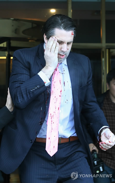 | △ 민화협 행사장서 괴한 공격당한 리퍼트 주한 미 대사 (서울=연합뉴스) 김주성 기자 = 마크 리퍼트 주한 미대사가 5일 오전 서울 세종문화회관에서 열린 민화협 주최 초청 강연에 참석했다가 괴한의 공격을 받고 피를 흘리며 행사장을 빠져나가고 있다. |