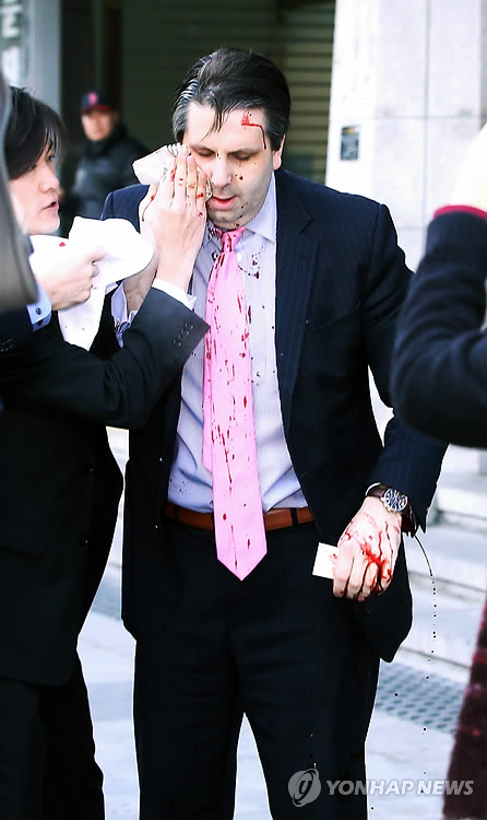 | △ 피 쏟아져 나오는 리퍼트 대사의 왼쪽 팔목 (서울=연합뉴스) 김주성 기자 = 마크 리퍼트 주한 미대사가 5일 오전 서울 세종문화회관에서 열린 민화협 주최 초청 강연에 참석했다가 김기종(우리마당 대표)씨로부터 공격을 받고 피를 흘리며 행사장을 빠져나오고 있다. 왼쪽 습격을 당한 팔목 부위에서 피가 쏟아지고 있다. |