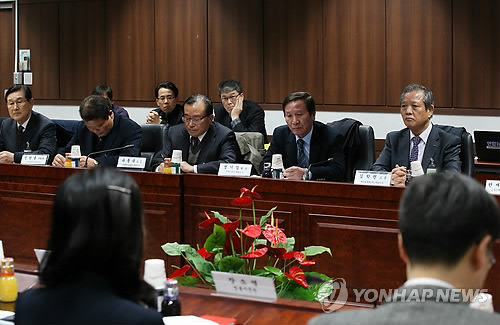 | △ 정부, 개성공단 업체와 '北임금인상' 대책 논의 (서울=연합뉴스) 전수영 기자 = 북한이 개성공단 북측 근로자의 임금 인상을 일방적으로 통보한 데 대한 대책회의가 5일 오후 서울 세종로 정부서울청사에서 열려 정기섭(오른쪽 두번째) 개성공단기업협회 회장을 비롯한 개성공단 입주 기업인들이 이강우 통일부 남북협력지구발전기획단장의 모두발언을 듣고 있다. |