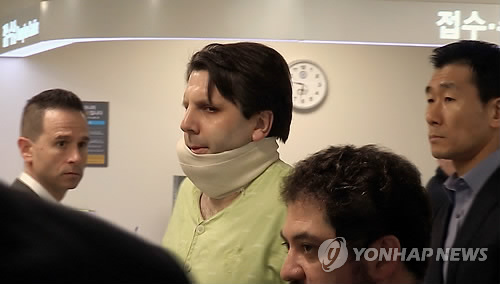 | △ 신촌 세브란스병원 들어가는 마크 리퍼트 대사 (서울=연합뉴스) 5일 오전 흉기 습격을 당한 마크 리퍼트 주한 미국 대사가 서울 서대문구 신촌세브란스 병원으로 들어가고 있다. 2015.3.5 << 연합뉴스TV >> photo@yna.co.kr |