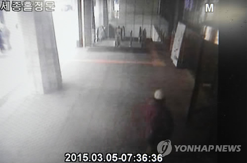 경찰이 공개한 약 10초 분량의 이 CCTV 영상에는 김씨가 붉은색 의상을 입고 가방을 멘 채 재빠른 걸음으로 세종홀 내부로 들어가는 모습이 담겼다.